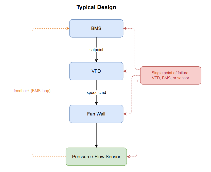 When the VFD faults, the fan wall stops. When the BMS loses communication or the controller faults, the VFD runs at its last commanded speed or falls back to a fixed default. When a sensor fails, the control loop loses its feedback and the BMS can no longer regulate to setpoint. Any of these failures requires manual intervention to restore normal operation.