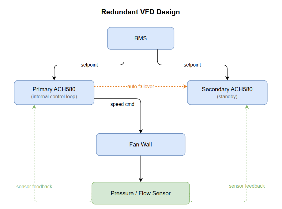 A primary ACH580 VFD drives the fan wall and fails over automatically to a secondary ACH580 on a fault output. Each drive runs its own internal control loop with duct static pressure or airflow sensors wired directly to the VFDs. The BMS delivers a networked setpoint to both drives rather than running the control loop itself.